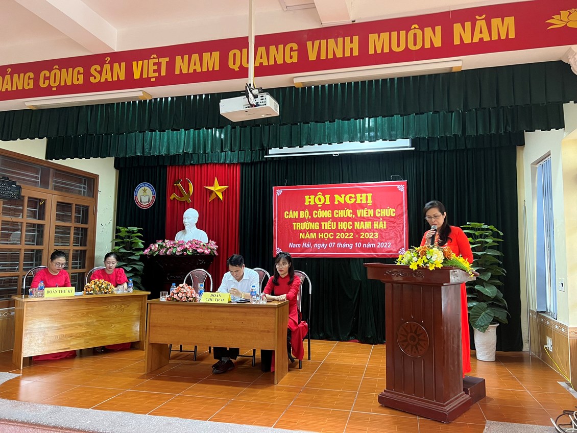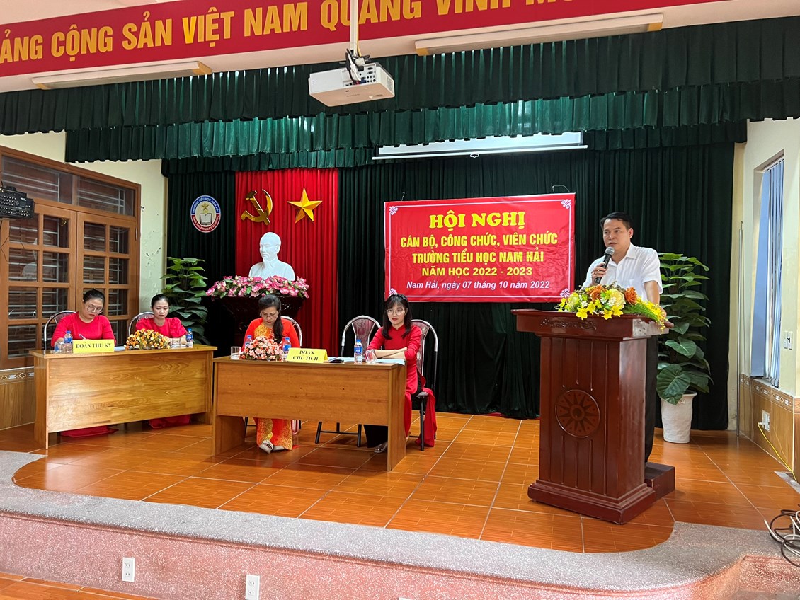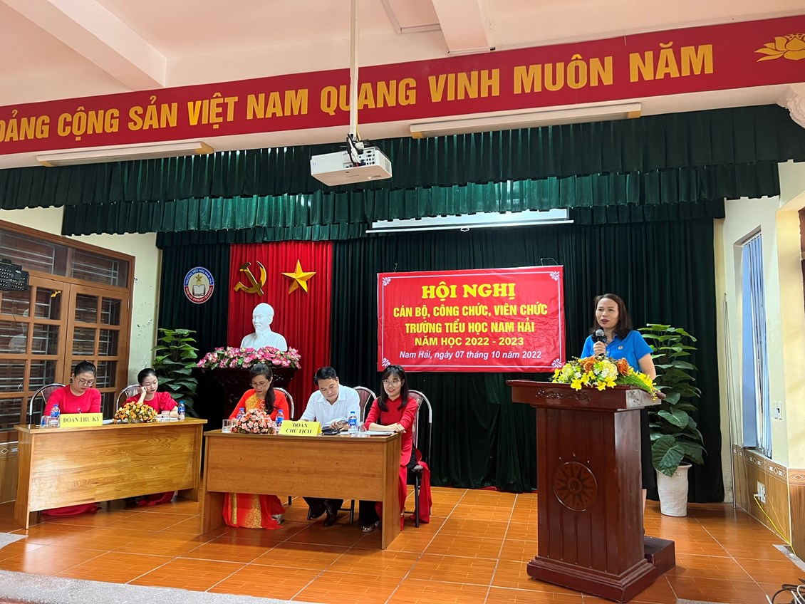 Thực hiện công văn số 1848/UBND-LĐLĐ, lịch công tác tháng 10 của PGD&ĐT quận, kế hoạch công tác của trường TH Nam Hải, ngày 07/10/2022 trường Tiểu học Nam Hải đã tổ chức hội nghị CBCCVC năm học 2022-2023.