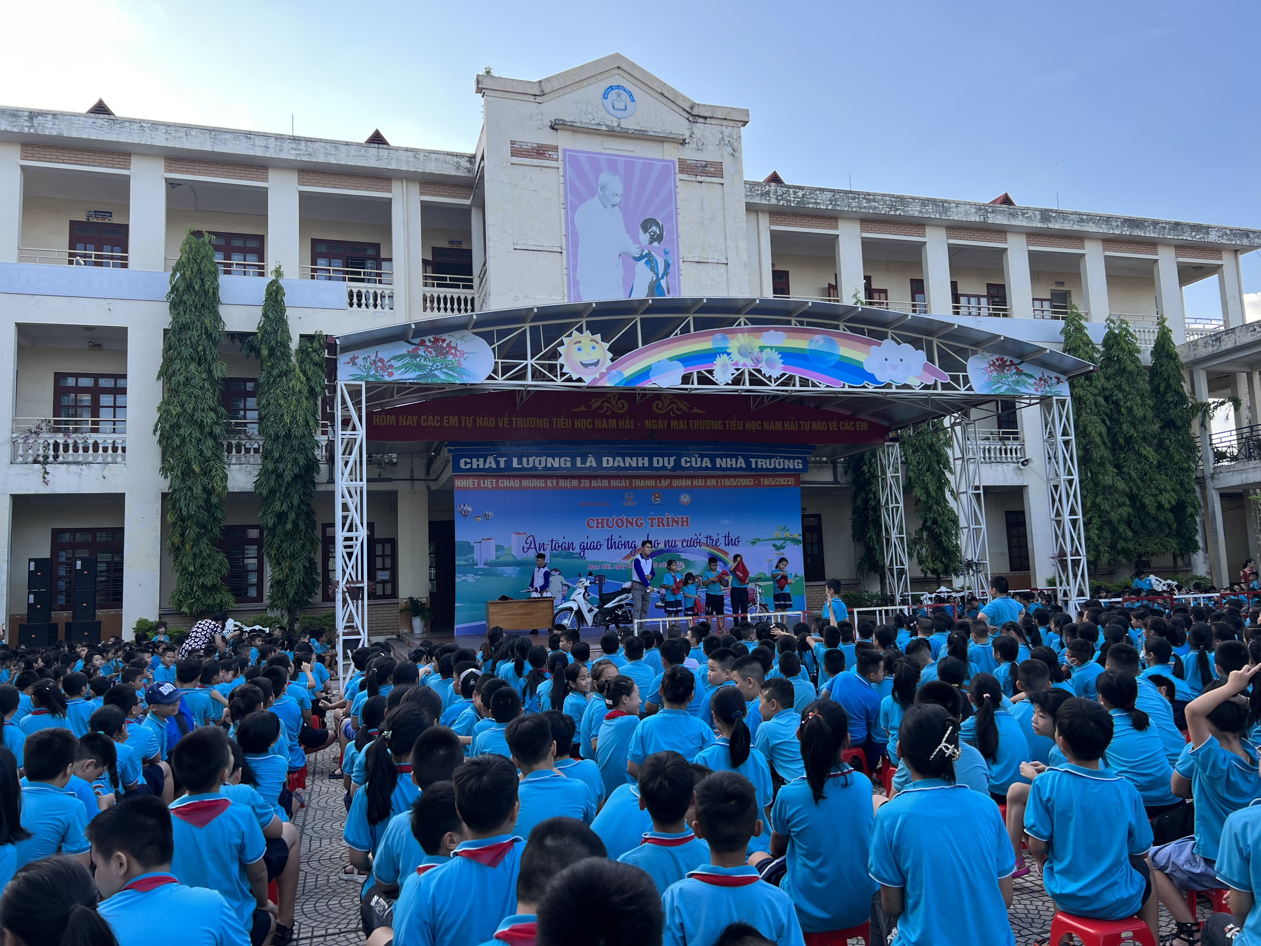 Tiếp tục phát huy hiệu quả công tác tuyên truyền ATGT cho học sinh của mình trong những năm học trước, ngày 04/10/2022, trường Tiểu học Nam Hải phối hợp với Công ty trách nhiệm hữu hạn Hồng Phát tuyên truyền cho các em những quy định khi tham gia giao thông với phương pháp truyền đạt cụ thể, dễ hiểu cùng với những hình ảnh trực quan sinh động, giúp các em dễ hiểu, dễ nhớ. Nội dung các em được tiếp thu như: hệ thống báo hiệu đường bộ; đi xe đạp an toàn; ngồi sau xe đạp, xe máy an toàn; đi qua cầu đường bộ an toàn; thực hiện văn hóa giao thông; …