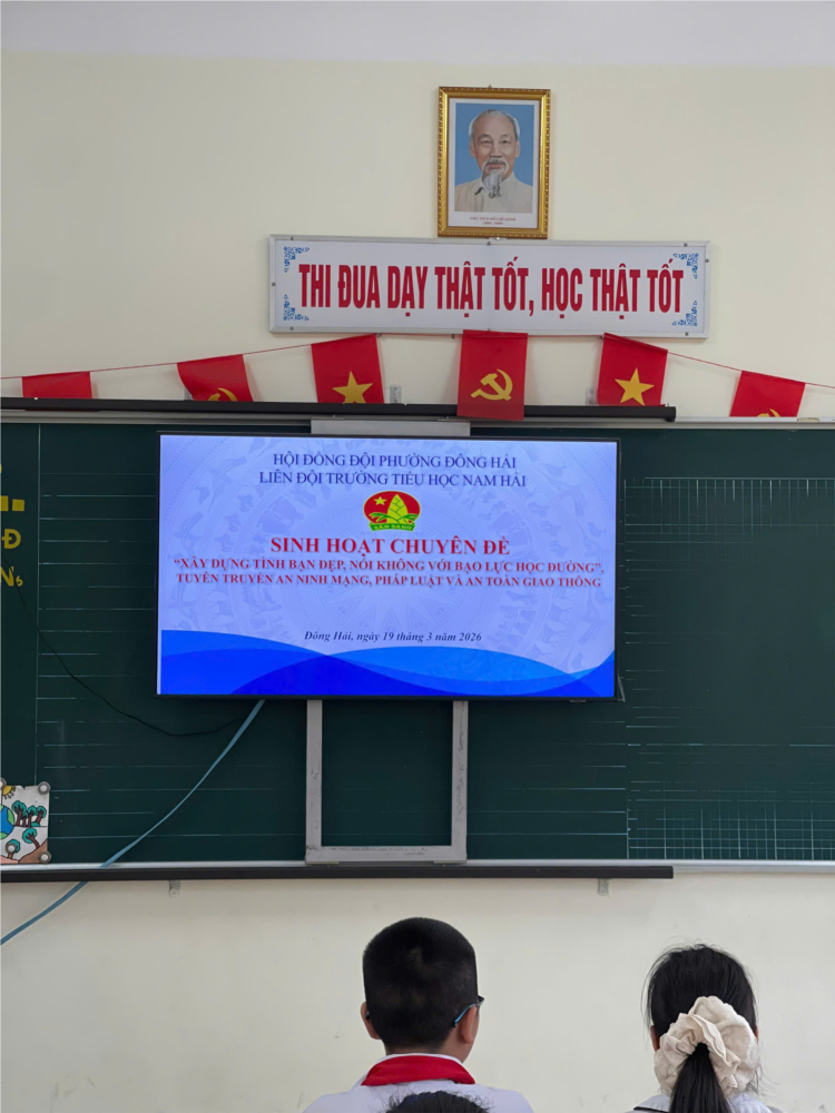 Thực hiện chương trình công tác đội năm học 2025-2026, liên đội trường Tiểu học Nam Hải đã tổ chức sinh hoạt chuyên đề “Xây dựng tình bạn đẹp, nói không với bạo lực học đường”, tham gia sinh hoạt chuyên đề có GVCN, BCH liên đội và đại diện các tập thể lớp. Buổi sinh hoạt đã giáo dục ý thức đạo đức, lối sống văn hóa, ngăn chặn nạn bạo lực học đường, định hướng xây dựng tình bạn đẹp cho học sinh; tạo môi trường, không khí để học sinh chủ động chia sẻ, trao đổi những vấn đề liên quan về phòng, chống bạo lực học đường; định hướng cho học sinh những chuẩn mực về ý thức, hành vi trong xây dựng tình bạn đẹp cũng như các mối quan hệ khác trong Nhà trường; trau dồi cho học sinh kỹ năng xử lý tình huống để ngăn chặn bạo lực học đường hoặc tham gia giải quyết, đấu tranh với các hành vi bạo lực học đường.