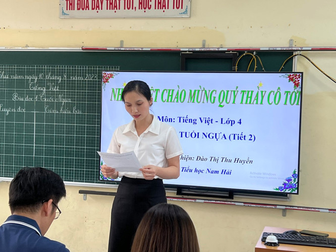 Trong buổi sinh hoạt chuyên môn, đồng chí Đào Thị Thu Huyền đã chia sẻ, trình bày nội dung cơ bản của môn Tiếng Việt và những điểm mới của cuốn sách so với sách giáo khoa hiện hành, đồng thời lên tiết dạy minh họa môn Tiếng Việt - Bài đọc 1: Tuổi ngựa (Tiết 2)