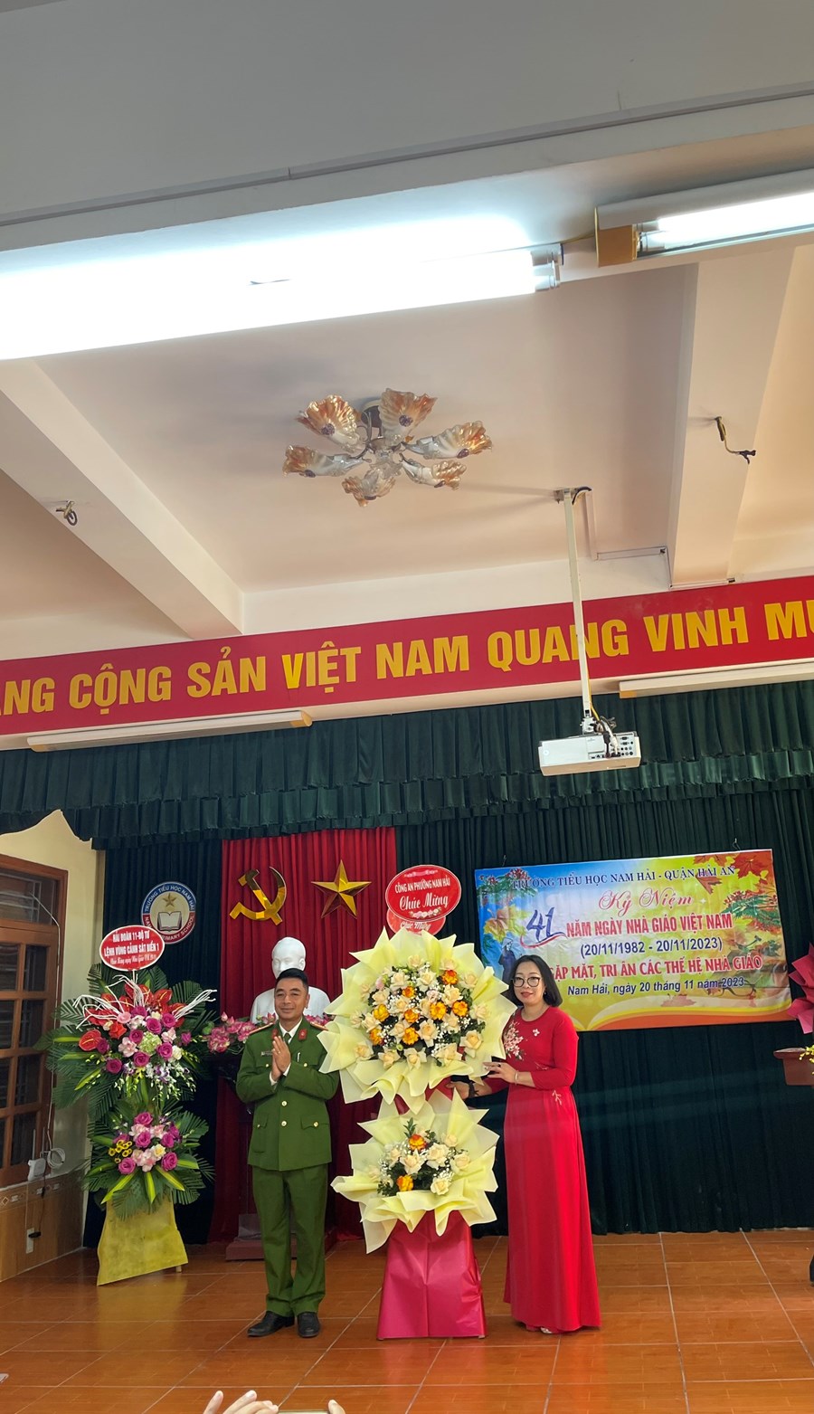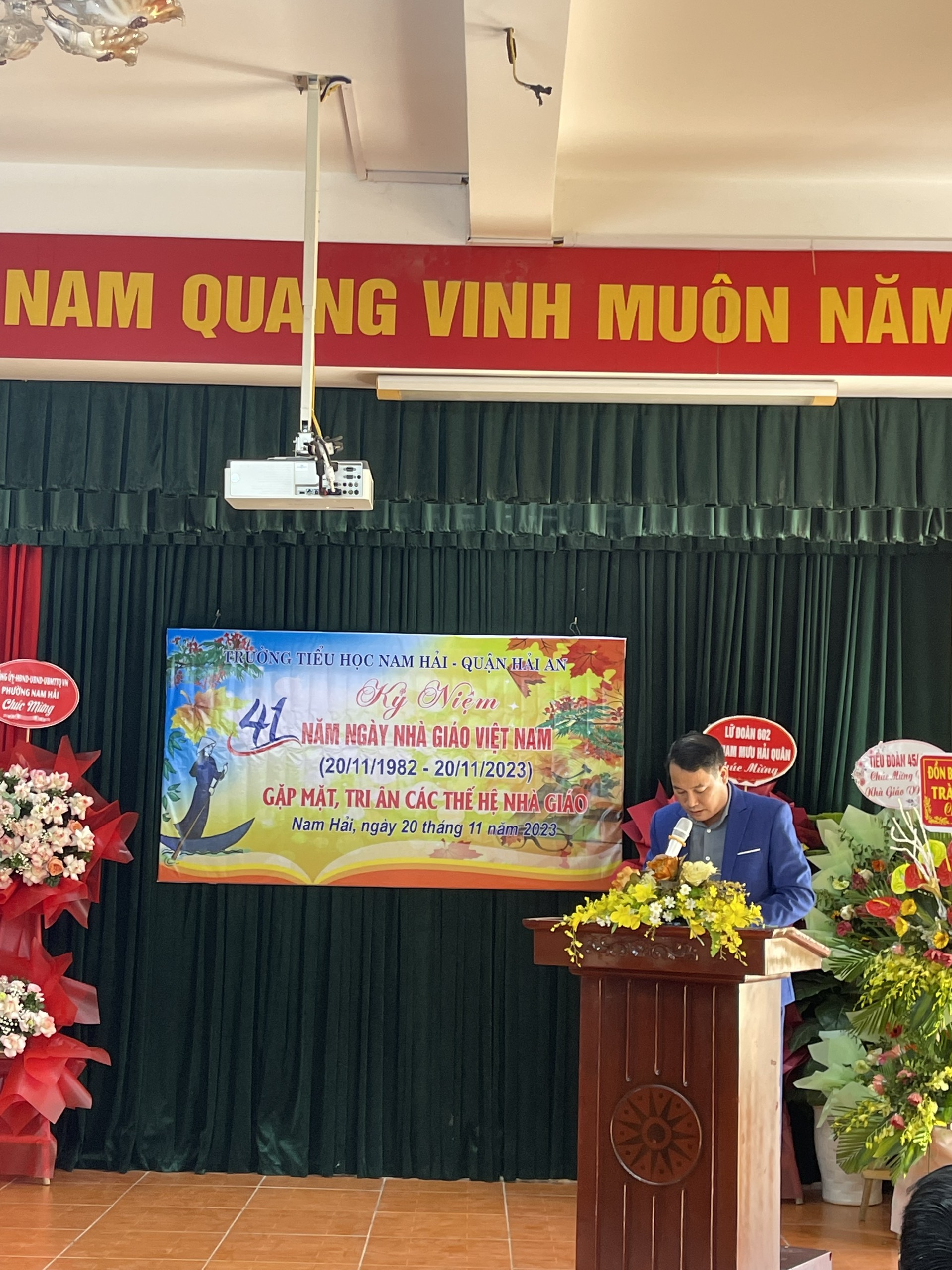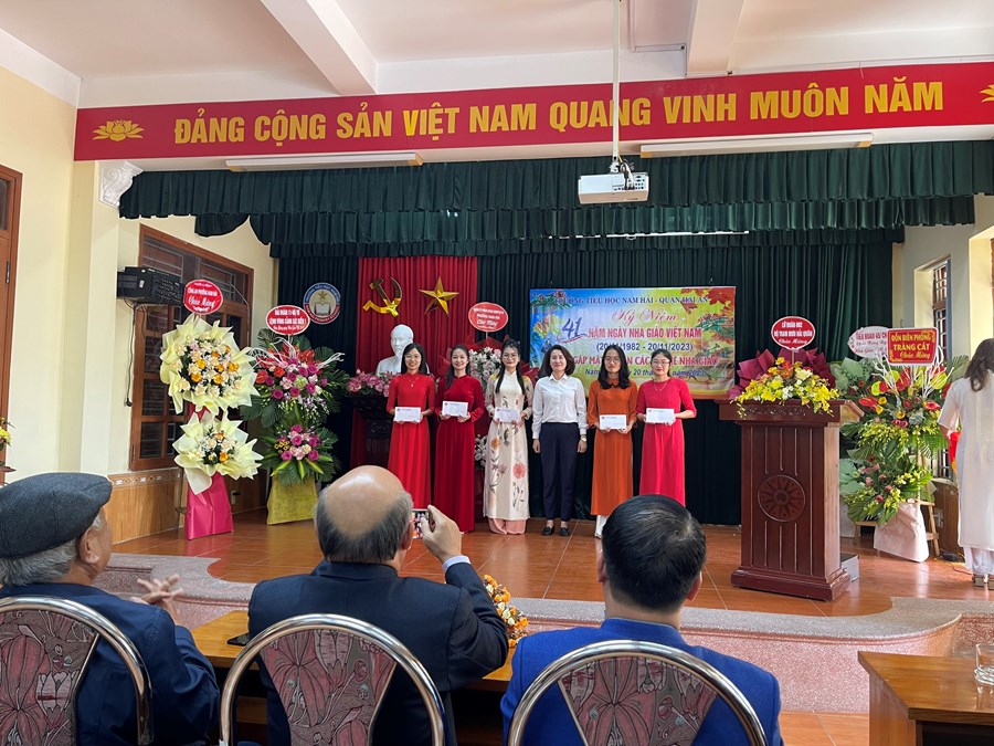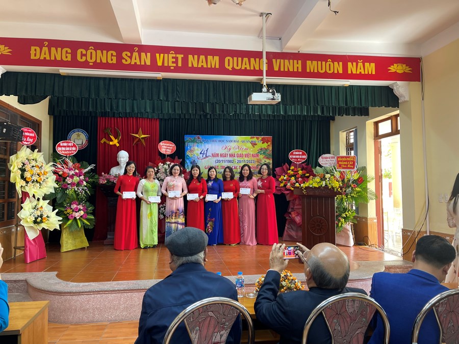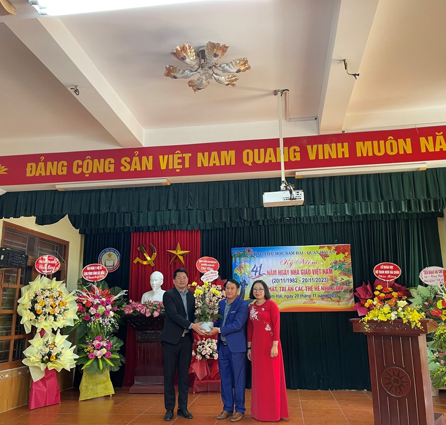 Ngày 20/11 hàng năm đã đi vào lịch sử như một ngày hội lớn của dân tộc. Được sự quan tâm của các cấp chính quyền, các ban ngành đoàn thể và nhân dân tin yêu, thấu hiểu, coi trọng “Nghề dạy học là nghề cao quý nhất trong các nghề cao quý”. Vị thế của người thầy luôn được xã hội tôn vinh. Trong ngày vui hôm nay, để ghi nhận, tri ân những đóng góp to lớn của đội ngũ cán bộ, nhà giáo đối với sự nghiệp giáo dục; nhằm động viên, khích lệ các thầy giáo cô giáo tích cực học tập, sáng tạo, phát huy năng lực, thi đua dạy tốt, học tập tốt, xây dựng đội ngũ nhà giáo theo hướng chuẩn về chuyên môn, tư tưởng đạo đức trong sáng, năng lực chuyên môn vững vàng, thật sự tâm huyết, yêu nghề và gắn bó với nghề, lãnh đạo Đảng ủy - HĐND – UBND - UBMTTQ Việt Nam phường Nam Hải, các ban ngành đoàn thể, đơn vị kết nghĩa, Hội CMHS nhà trường đã có những lẵng hoa tươi thắm gửi tặng toàn thể CB - GV – NV nhà trường.