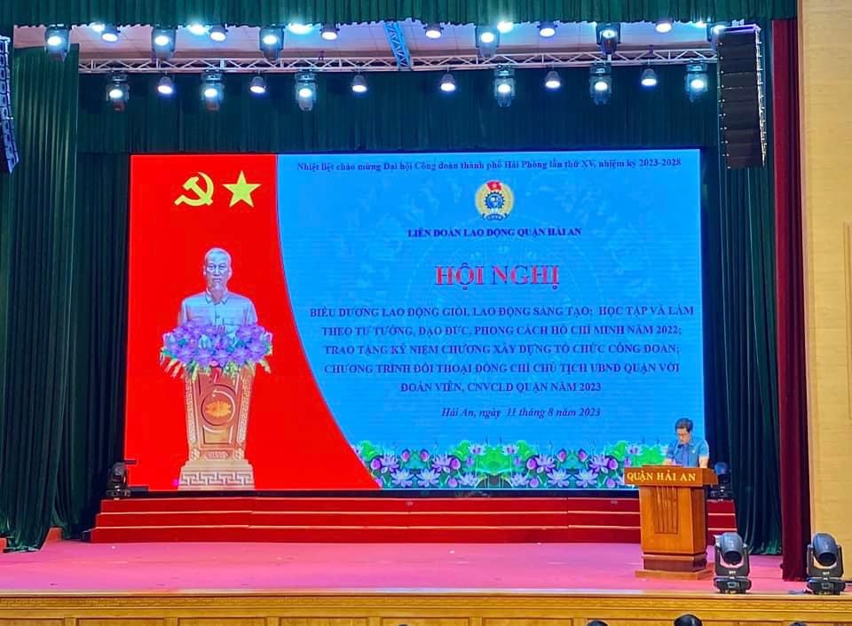Chiều ngày 11/8, Liên đoàn Lao động Quận Hải An tổ chức Hội nghị Biểu dương Lao động sáng tạo, Lao động giỏi; học tập và làm theo tư tưởng, đạo đức, phong cách Hồ Chí Minh năm 2022; trao tặng Kỷ niệm chương vì sự nghiệp xây dựng tổ chức Công đoàn; Chương trình đối thoại giữa đồng chí Chủ tịch UBND quận với Công nhân viên chức lao động quận năm 2023.