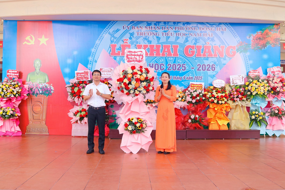 Đồng chí Đinh Minh Tâm - Phó Chủ tịch phường Đông Hải tặng hoa chúc mừng nhà trường