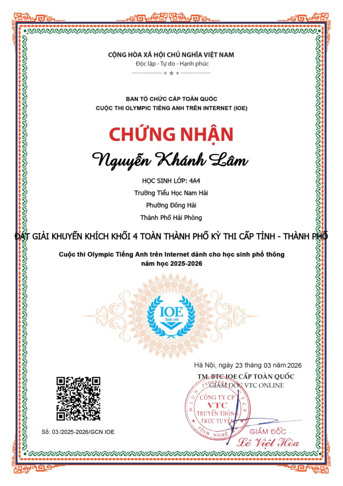 Nhà trường xin chúc mừng các em học sinh đã xuất sắc đạt giải trong kỳ thi Olympic Tiếng Anh trên Internet (IOE) cấp thành phố năm học 2025–2026. Đây là thành quả xứng đáng cho sự nỗ lực, chăm chỉ học tập và tinh thần vượt khó của các em.